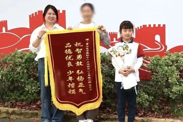 过后,小男孩家长送来锦旗抒发感谢,上头写着“机智勇敢、进展浩气、品德优良、少年楷模”。