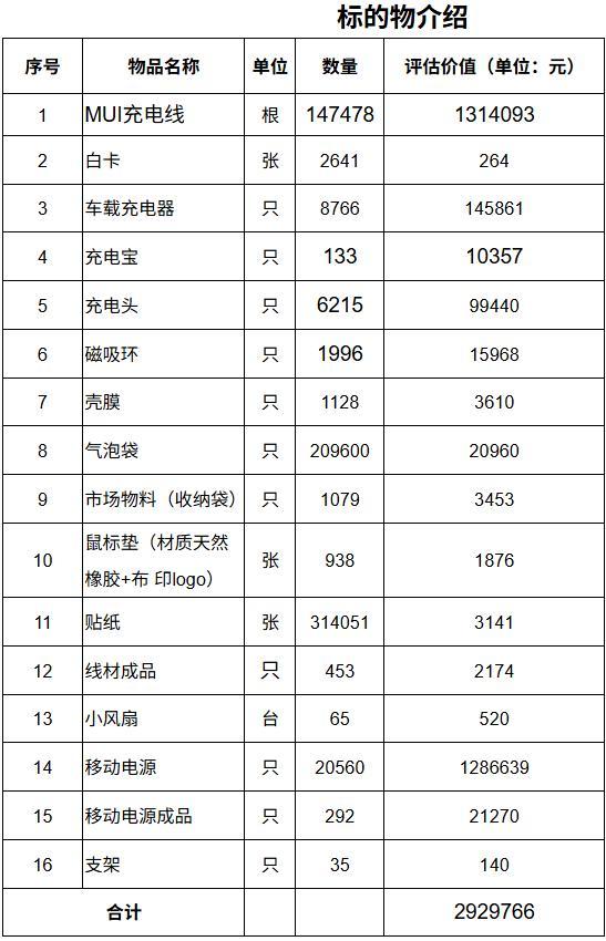 147478 根 MUI 充电线,评估价约 131.4 万元;