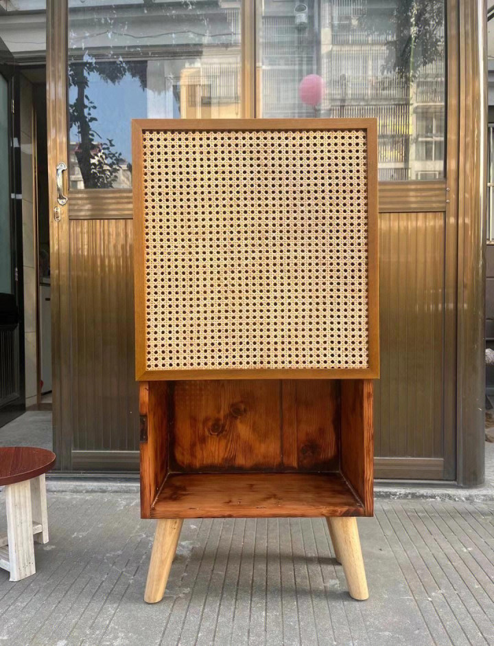 柜门简便打磨,锅盖画出圆弧形,贴上PU线条,刷上黑漆,终末用钉枪固定藤编遮挡。几十年的老衣柜,摇身一酿成了圭臬相持风,市集价大几千 。
