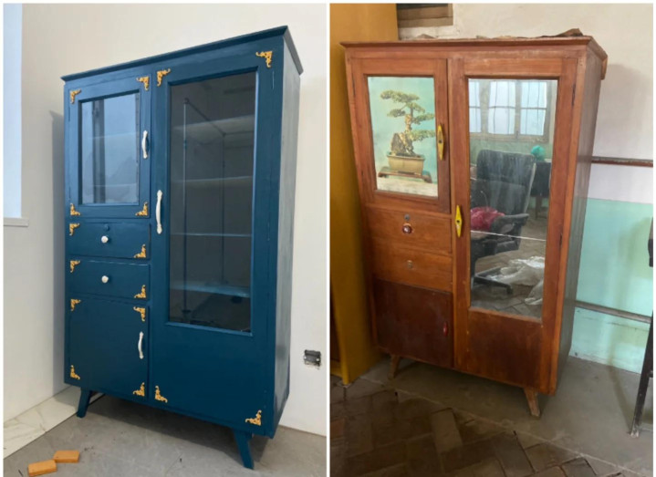拆掉旧配件,打磨抛光,刷上白漆,装上雕花遮挡和水波纹玻璃。一又友来家里皆问:这柜子哪儿买的,看着太高等了 。