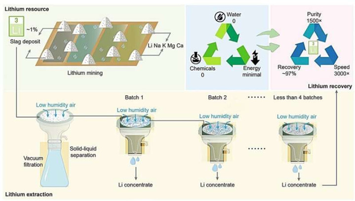 盘问东说念主员哄骗水合氯化锂(LHT)的吸湿性,从采矿废物中提真金不怕火和浓缩锂。这种按序仅依靠空气中的水分,无需多半淡水或化学添加剂,终明晰高达97%的锂回收率,并将锂纯度普及1500倍,产生的浓缩物锂含量达到97,000 ppm,真钱三公是电板加工规范浓度的两倍以上。